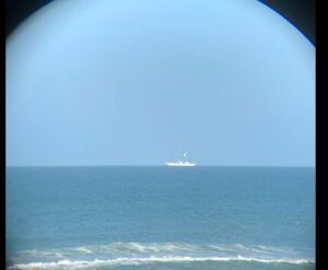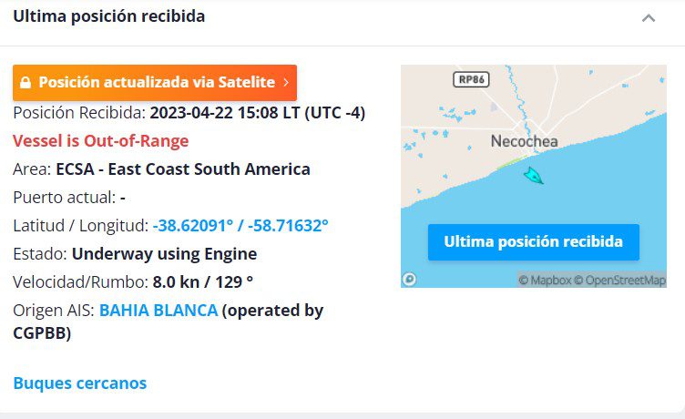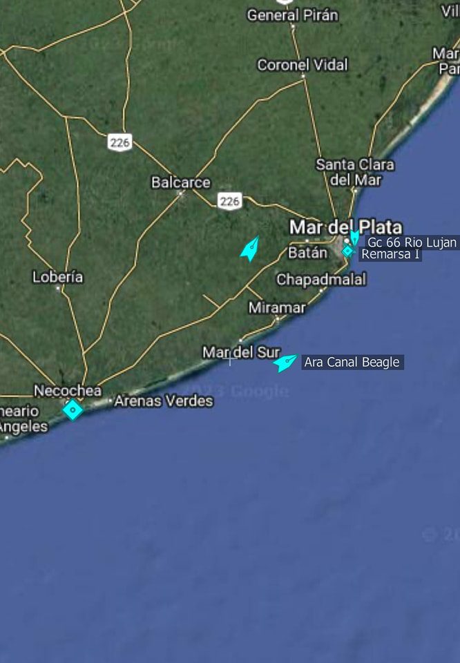Las fotos fueron compartidas por el propietario del parador Karamawi que logró registrar la pasada del buque de la Armada Argentina mientras, en el sitio MarineTraffic se reporta a Necochea como la última posición recibida, a las 15.08 de este domingo.