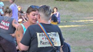El encuentro empezó en el anfiteatro y de allí la columna tomó por calle 6 donde realizaron la primera parada, en el tribunal Oral Criminal de calle 87 para pedir la absolución de Pierina Nochetti, la joven procesada por haber pintado una consigna sobre Tehuel en el Anfiteatro.