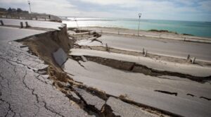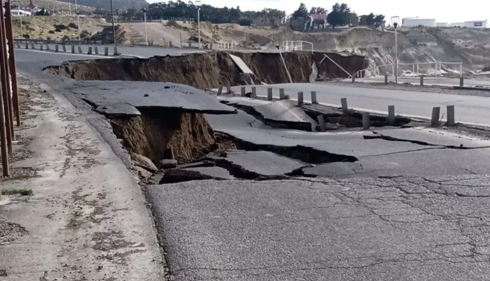 La semana pasada habían aparecido grietas y fisuras que llevaron a que se tome la decisión de cortar la circulación de camiones y el lunes, finalmente, se interrumpió el tránsito para que ningún vehículo pueda circular por la calzada en la zona de curva que se ubica entre el cerro Chenque y el acantilado que da al mar.