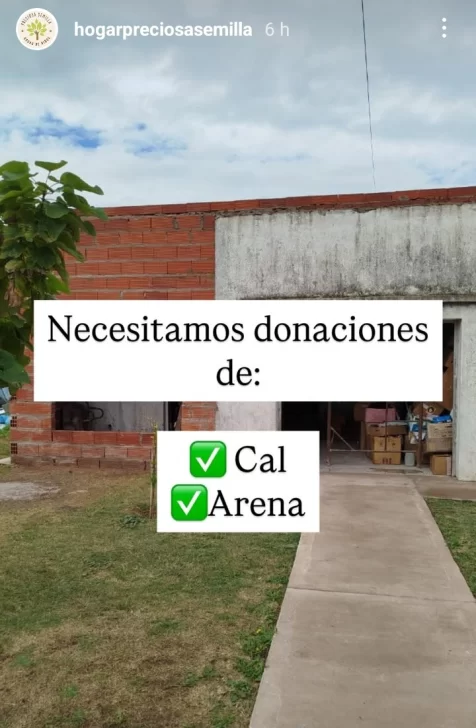 El hogar funciona a cargo de Juliana Bravo y Diego Parigino, quienes confirmaron a través de las redes del “Preciosa Semilla” que “solo nos queda por conseguir CAL y ARENA”.