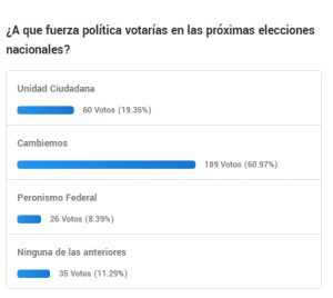En la última encuesta de la web de TSN la fuerza política del oficialismo a nivel nacional fue la que obtuvo más votos ante la pregunta de a cuál votarías en las próximas elecciones.