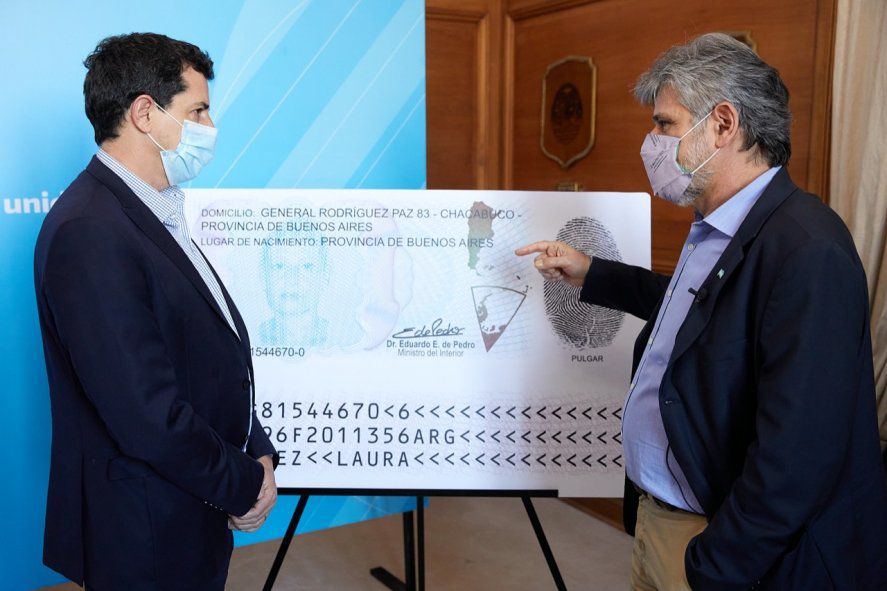 El ministro del Interior ,Wado de Pedro, y el secretario de Malvinas, Antártida y Atlántico Sur de la Cancillería, Daniel Filmus, presentaron hoy el nuevo DNI que incluye una actualización que incorpora la plataforma bicontinental al mapa del territorio nacional.