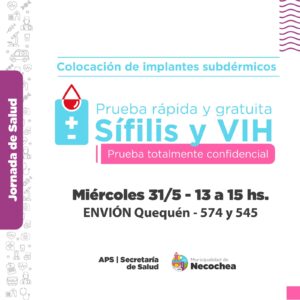 Hoy se realizarán las pruebas gratuitas y confidenciales de detección de Sífilis, VIH en el marco del operativo semanal que se lleva adelante en Envión de Quequén, en 574 y 545, de 13 a 15.