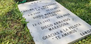 Sin embargo esto no habría sido un impedimento para la Doctora en Ciencias Sociales e Investigadora del CONICET, Cora Gamarnik, quien publicó en su cuenta de la red social Twitter una imagen de la tumba de Diego Maradona captada a pocos centímetros en la que pueden leerse los nombres y los apodos de su madre Dalma Maradona “La Tota”, de su padre Diego Maradona “Chitoro”, con sus respectivas fechas de nacimiento y fallecimiento, y más abajo está el nombre completo de Diego Armando Maradona (sin su apodo “Pelusa” ni sus fechas) y finalmente la frase que alguna vez había pedido que se coloque sobre su lápida: “GRACIAS A LA PELOTA”. Luego aparece la consigna “Te Amamos”, en nombre de sus hijas.