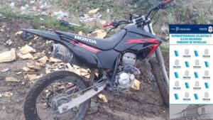 La policía llegó al lugar y observó a los dos masculinos, uno de ellos reconocido por su prontuario delictual, pero estos, al ver el móvil policial, se dieron a la fuga por descampados abandonando una moto marca Honda XR250 sin dominio colocado.