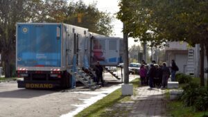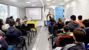 En la esquina de 521 y 560 se apostó el tráiler de grandes dimensiones donde se dictaron los primeros talleres y capacitaciones destinadas preferentemente a alumnos y alumnas de establecimientos educativos, con abordaje directo sobre problemáticas como el bullying, ciberbullying y grooming.