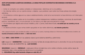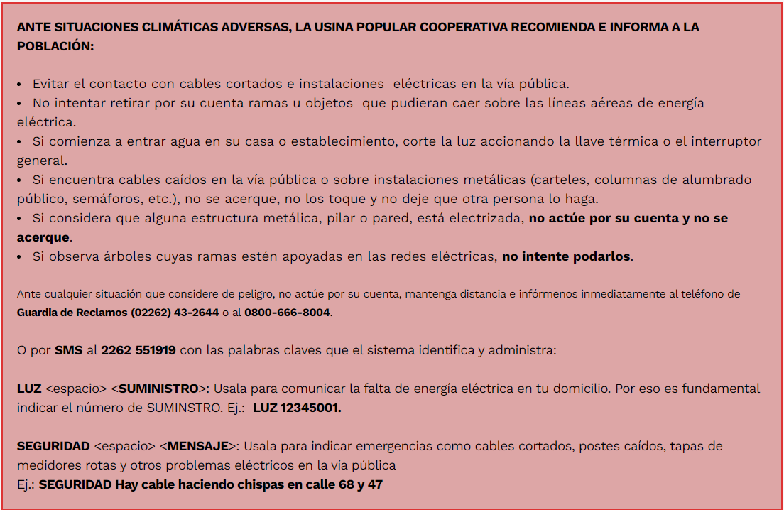 Ante la advertencia, la Usina Popular Cooperativa emitió una serie de recomendaciones a tener en cuenta por los usuarios del servicio: