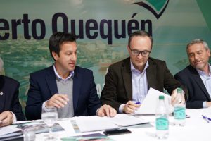 Avanzando a paso firme hacia la unión de las márgenes viales de la estación marítima, el Presidente del Consorcio de Gestión de Puerto Quequén, Dr. Arturo Rojas, firmó el Acuerdo de Colaboración para Financiación de la Obra de Reconstrucción del Puente Ezcurra con el Presidente de la Cámara de la Industria Aceitera y el Centro de Exportadores de Cereales de la República Argentina (CIARA-CEC), Gustavo Idígoras, y el Gerente General de la Cámara de Puertos Privados de la República Argentina, Dr. Martín Brindici.
