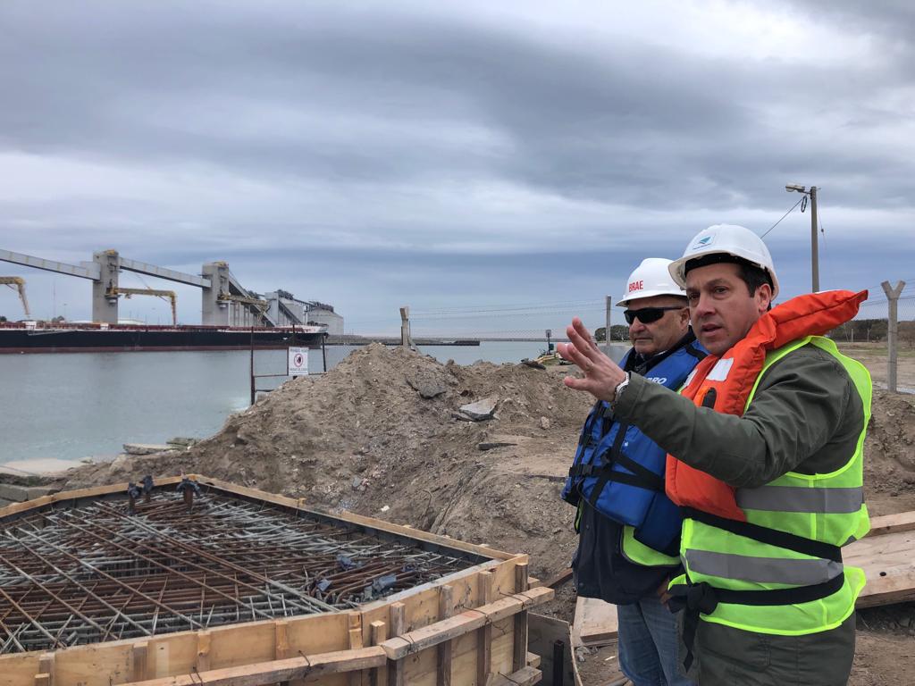 A días de concretarse la construcción del nuevo muelle de ultramar en el giro 12 de Puerto Quequén, acompañado por el Jefe de Obra, Julio Pazzi, el Presidente del Consorcio de Gestión, Arturo Rojas, recorrió el predio donde ya se vislumbran las bases de la nueva terminal de fertilizantes sobre la margen Necochea.