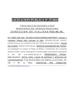 Hace instantes, Vialidad Provincia, hizo público el llamado a licitación para la obra de reparación del Puente Dardo Rocha. El presupuesto oficial es de $ 360.1896.487, 67. La apertura de los sobres es el 17 de julio. Noticia en Desarrollo….
