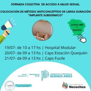 En el marco de garantizar el acceso a Derechos Sexuales, Salud Comunitaria y el Programa de Salud Sexual y (no) Reproductiva de Región Sanitaria VIII, se realizará durante tras días, una campaña gratuita de aplicación de implantes subdérmicos, también conocidos como chips, que es un método anticonceptivo de larga duración.