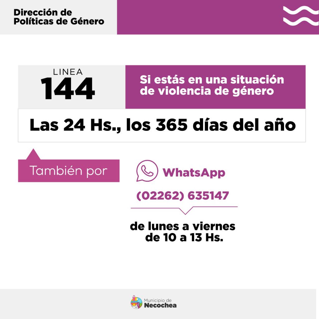 Además, indicó que “también podés enviar la palabra “Hola” vía WhatsApp o Telegram a los números (221)598-5988 o (221)353-0500 dentro de la Provincia de Buenos Aires, o al (011)2771-6463 en todo el territorio de la República Argentina. También podés escribir a linea144@mingeneros.gob.ar. o descargando la aplicación “144” desde Playstore o Appstore”.