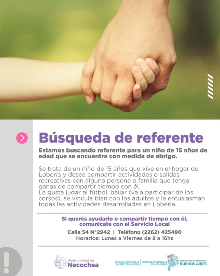 La Municipalidad de Necochea, a través de la Secretaría de Desarrollo Humano y el Servicio Local de Promoción y Protección de Derechos, informa que se encuentra abierta la búsqueda de referentes afectivos para dos niños oriundos de Necochea que actualmente se encuentran bajo medidas de abrigo en un hogar de tránsito de la ciudad de Lobería.