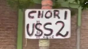 El viral fue compartido en la cuenta de Jeremías Madrazo, quien replicó el video que captó un vecino de la zona que, sorprendido, subió la imagen de un cartel atado al tronco de un árbol de su barrio en el que se leía: “Chori U$S2” y debajo aclara que se trata de la cotización del dólar blue.