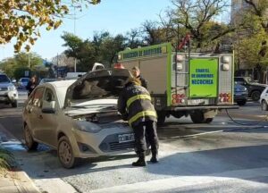 Una dotación del cuerpo de bomberos para apagar el siniestro qué ocurrió en la zona del motor de dicho rodado.