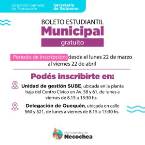 Desde hoy, de 8:15 a 13:30 en el Centro Cívico de Av. 58 y 61 y en el mismo horario en la Delegación de Quequén (560 y 521), comienza la inscripción y renovación del programa Boleto Estudiantil Municipal Gratuito mediante el Sistema Único de Boleto Electrónico (SUBE), la cual se extenderá hasta el 22 de abril.