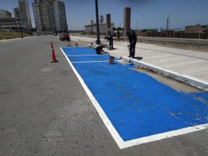 En varios puntos del frente costero demarcaron con pintura azul sectores puntuales de estacionamiento para personas con discapacidad y motos.