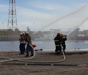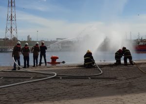 El Consorcio de Gestión del Puerto de Quequén, mediante la participación del personal de seguridad portuaria, en conjunto con el personal de Terminal Quequén y la Prefectura Naval Argentina con asiento en Puerto Quequén, a cargo del Sr. Prefecto Principal Cristian Leonel Mirabete, realizó un ejercicio de simulacro de un principio de incendio a bordo de un buque y hombre al agua, en el giro 6 de la estación marítima.