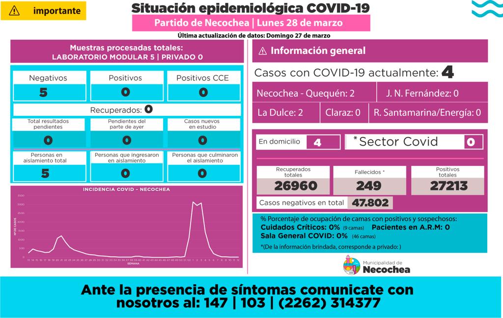 Debido a esto sólo hay 4 casos activos de covid en el distrito, distribuidos de la siguiente manera: dos en el núcleo urbano Necochea Quequén y dos a La Dulce.