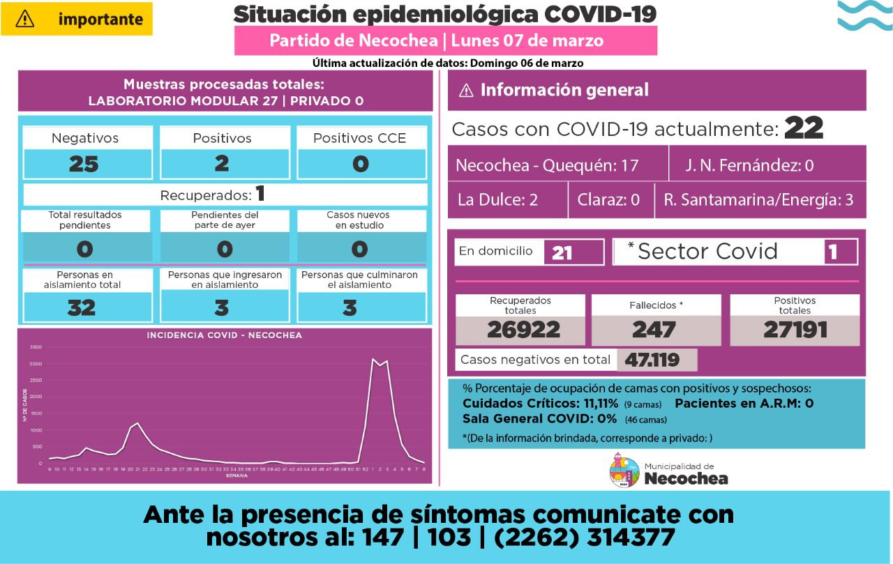 De esta manera hay 22 casos activos de covid en el distrito, estos están distribuidos de la siguiente manera 17 en Necochea y Quequén, 2 La Dulce y 3 en Ramón Santamarina.