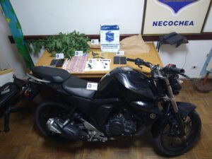 En el lugar se incautó marihuana en bagullos, flores de la misma sustancia y envoltorios de nylon conteniendo cocaína, estupefacientes que estaban fraccionados para su comercialización. También se secuestró una moto Yamaha de potente cilindrada que había sido robada hace un año, aparatos de telefonía celular y dinero en efectivo.
