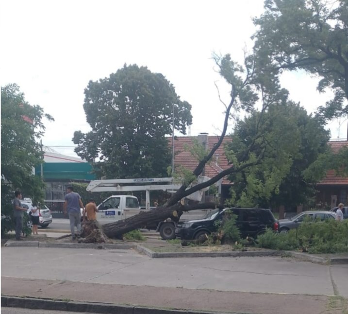 Varias ramas caídas, postes, cortes de luz y ahora un árbol, se registran durante el mediodía de este lunes debido al intenso temporal de viento Norte.