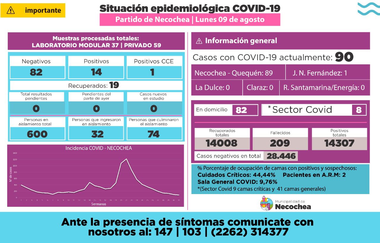 Por lo cual desde el inicio de la pandemia suman 209 personas que perdieron la vida. Actualmente hay 90 casos positivos de covid en el distrito, distribuidos de la siguiente manera: 89 Necochea y Quequén y uno en Juan N. Fernández.