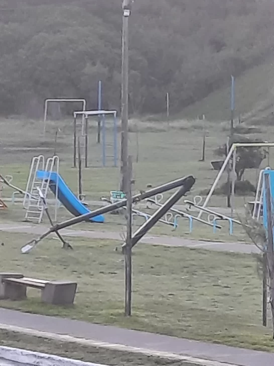 Un rayo cayó durante la tormenta de anoche sobre una luminaria de la plaza 3 de Agosto de Quequén y partió en dos la columna de alumbrado público.