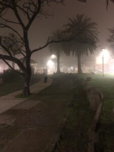 Pasadas las 21, la niebla invadió Necochea, tal como puede apreciarse en las imágenes captadas en la zona de la Villa Balnearia y parque.