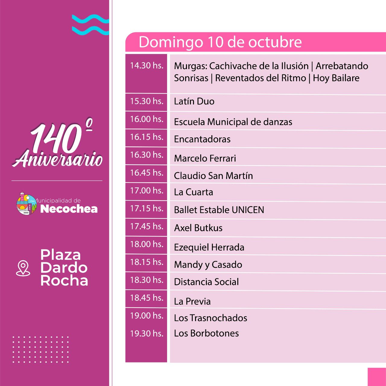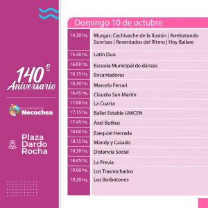 El buen tiempo de este sábado permitió que miles de necochenses y también turistas colmaran la Plaza Dardo Rocha, epicentro de numerosas actividades que forman parte de los festejos por un nuevo aniversario de la ciudad.