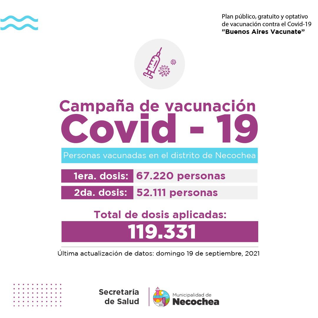 En cuarto a la campaña de vacunación que se desarrolla en los lugares habilitados se dio cuenta que se llevan aplicadas 119.331 dosis correspondiendo 67.220 al primer componente, y 52.211 del segundo.