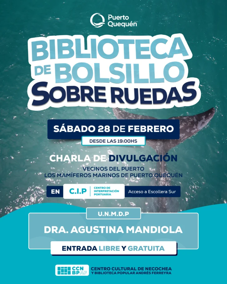 El Centro de Interpretación Portuaria (CIP) será escenario de una charla de divulgación sobre los mamíferos marinos de Puerto Quequén a cargo de la de Dra. Agustina Mandiola integrante del grupo de investigación “Biología, ecología y conservación de mamíferos marinos” Instituto de Investigaciones Marinas y Costeras. Facultad de Ciencias Exactas y Naturales. Universidad Nacional de Mar del Plata.