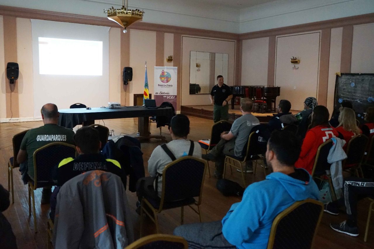 Con la capacitación a cargo del cuartel de Bomberos de Necochea, se desarrollan esta semana en el Salón de Actos de la Municipalidad charlas sobre incendios forestales, de las cuales participan agentes municipales de Defensa Civil y Guardaparques y también voluntarios de la filial local de Cruz Roja Argentina.