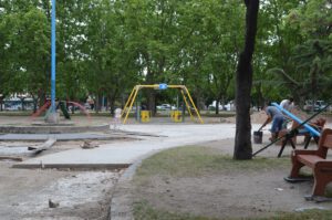Luego se refirió al sector de juegos específicamente, donde “personal del Corralón municipal está ejecutando una platea de hormigón donde posteriormente se van a colocar todos los juegos nuevos de la plaza, un piso de goma anti golpes y un montón de equipamiento urbano”.