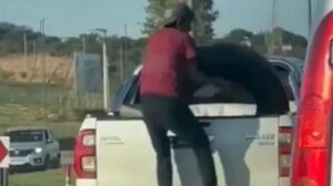 Luego de constatar que el tránsito se encontraba paralizado, el malviviente decidió acercarse hasta una camioneta blanca que transitaba a baja velocidad, y treparse por la puerta trasera para introducirse en la caja con fines ilícitos.