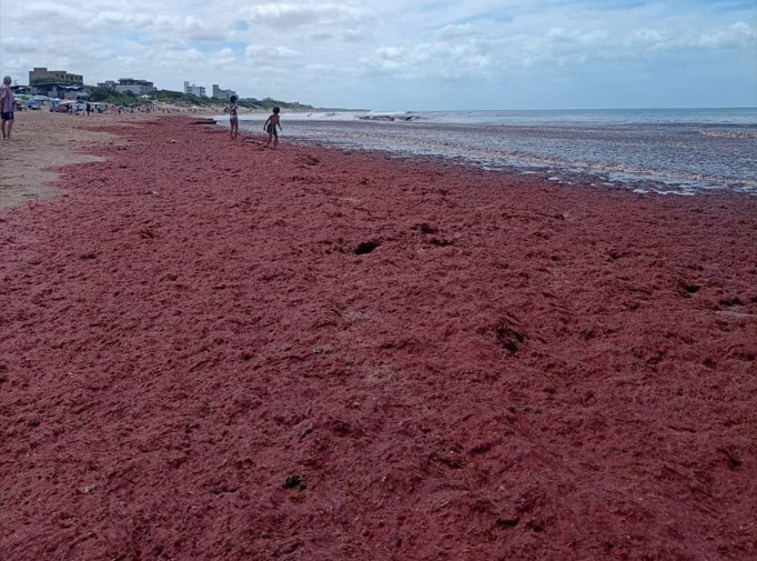 La postal sorprendió a vecinos y turistas que de inmediato compartieron las imágenes en las redes sociales. Como sucedió al año pasado, las algas rojas volvieron a invadir nuestras costas.