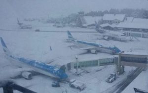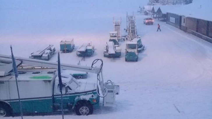 Si bien la estación aérea se encuentra en condiciones de operar, aún con nieve, la gran cantidad caída en muy poco espacio de tiempo esta madrugada hizo que las máquinas limpiadoras de pistas no dieran abasto, porque sigue nevando intensamente.