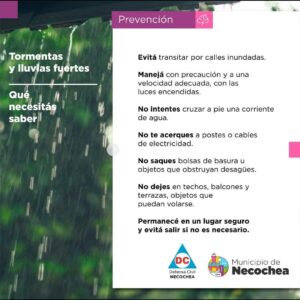 El organismo señala que el área se ve afectada por tormentas de variada intensidad, pudiendo ser algunas localmente fuertes. Se espera que las mismas estén acompañadas de ráfagas, ocasional caída de granizo, actividad eléctrica y fundamentalmente abundante caída de agua en cortos períodos.