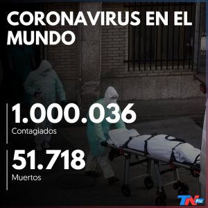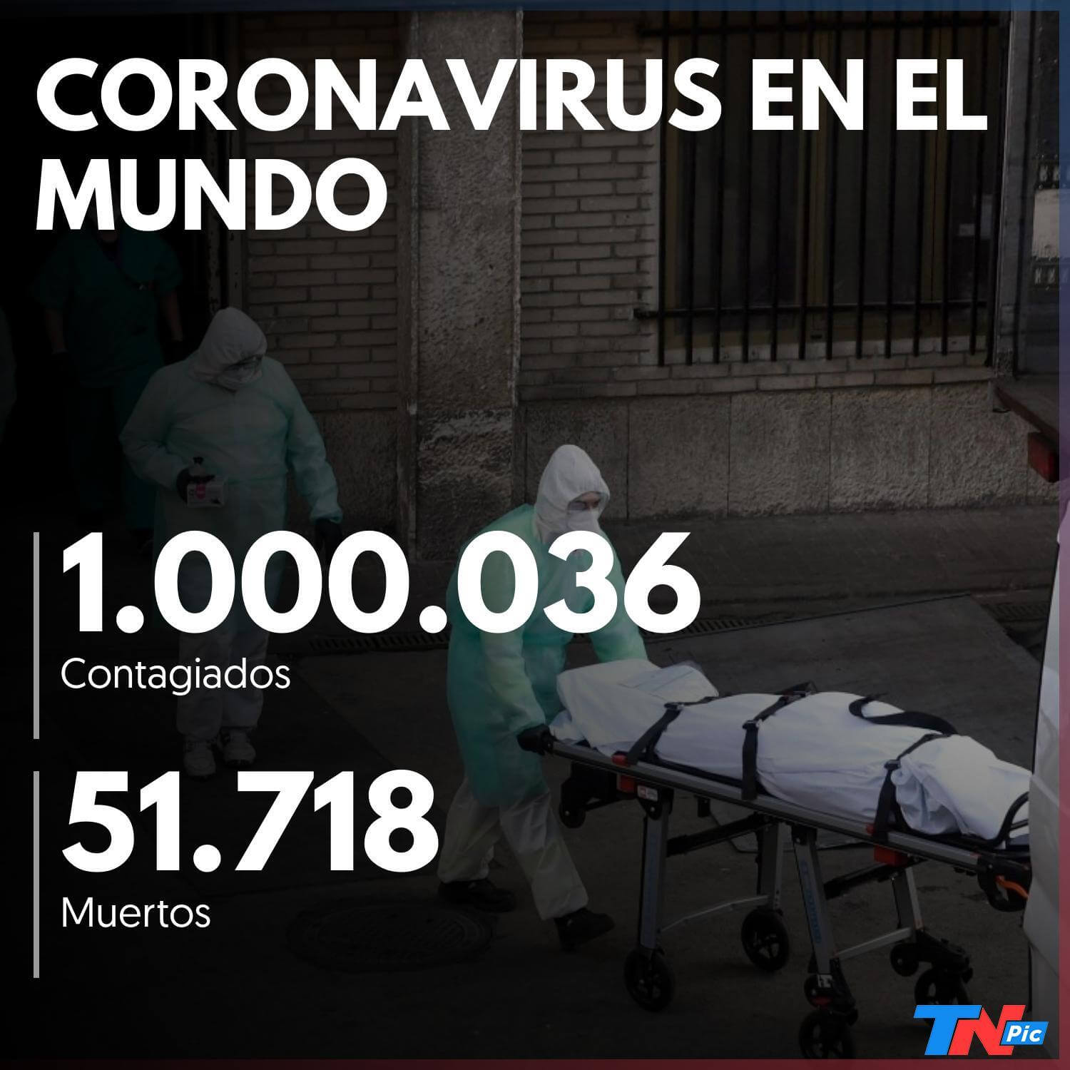 El mundo rompió este jueves la barrera de las 50.000 muertes por coronavirus y ya hay un millón de personas que contrajeron la enfermedad, según la herramienta de monitoreo Worldometer. Hay 188 países afectados. Hasta la fecha se registraron al menos 1.000.036 contagiados y 51.718 víctimas fatales.