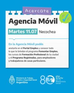 El programa nacional Agencia Móvil busca descentralizar el servicio de atención de las Agencias Territoriales a través de la realización de visitas (operativos). Hoy estará en Necochea de 10 a 13 en la sede de CGT de calle 72 entre 51 y 53 y mañana de 10 a 13 frente a la Delegación en Quequén en 521 y 560.