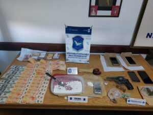 Además, se incautaron flores de Marihuana, un arma de fuego marca Doberman calibre 32 largo sin numeración visible, telefonía celular y anotaciones de interés para la investigación.