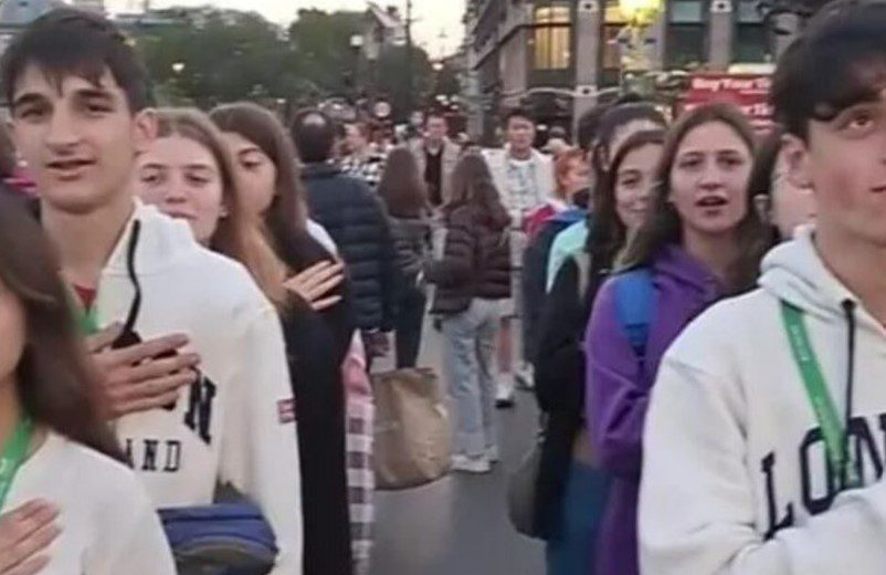 Los jóvenes decidieron pararse frente al Palacio de Westminster y cantar el himno que homenajea a los argentinos caídos en la Guerra de Malvinas. En el video, se ve a los estudiantes entonando las estrofas del clásico tema con una mano en el pecho a la altura del corazón. Las imágenes culminan con un paneo al Big Ben, el icónico monumento británico.