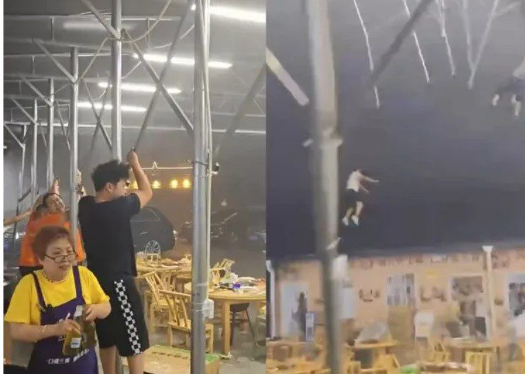 Las imágenes del hecho se difundieron a través de las redes sociales. Según trascendió, el pasado lunes, el dueño del restaurante le solicitó a los clientes que lo ayudaran a hacer contrapeso en las columnas que sostenían el techo del lugar.