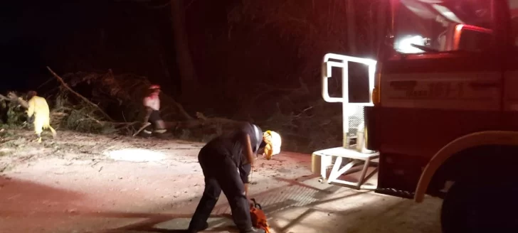 Los bomberos voluntarios de La Dulce trabajaron durante la madrugada para despejar la ruta 85, tras la caída de un gran árbol frente al establecimiento San José, de la firma Buck.