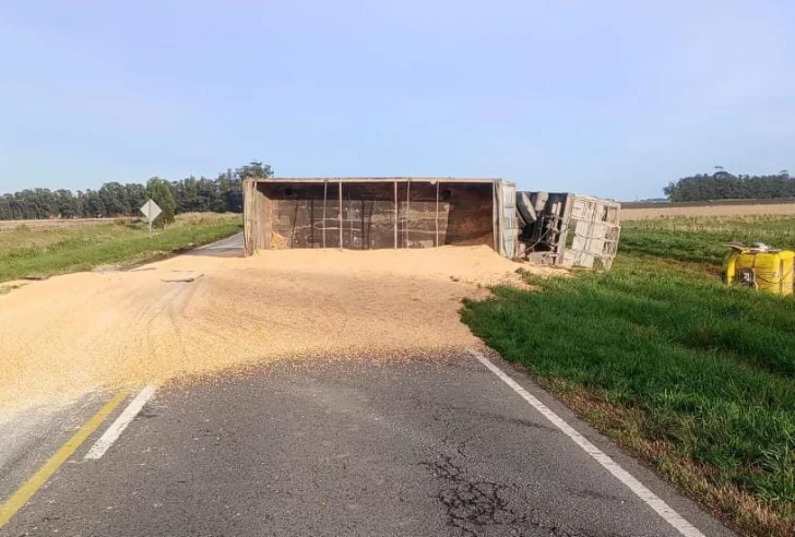Un camión cargado con maíz volcó sobre la cinta asfáltica en el kilómetro 17 de la Ruta 228, quedando el tránsito interrumpido hasta completar las tareas de limpieza.