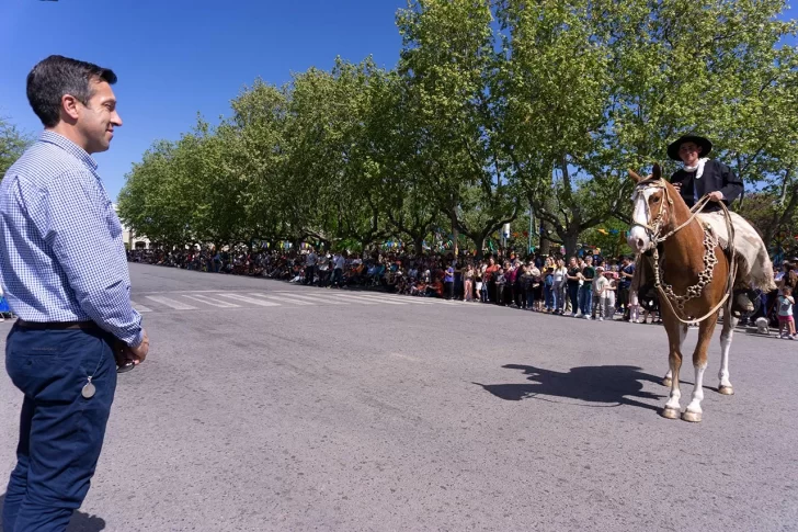 Fue precisamente el jefe comunal quien a las 14.30 con exactitud le autorizó al gaucho a caballo Miqueas Gratia el inicio del desfile que partió desde 56 y 59 con los Veteranos de la Guerra de Malvinas necochenses, llevando con orgullo la bandera celeste y blanca y siendo reconocidos una vez más por todo el pueblo, y que siguió con los jardines maternales municipales y una enorme fila de instituciones educativas de todos los niveles del distrito.