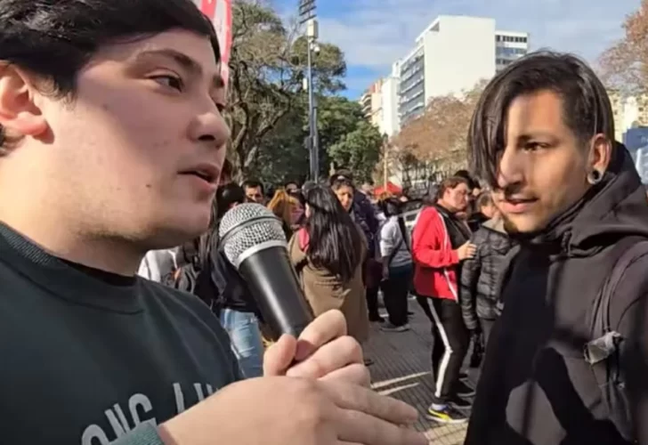 En un nuevo intento por continuar con su tarea, Pérez se propuso a entrevistar a otro manifestante. Como era de esperar, el diálogo fue interrumpido por el joven vestido de negro, que aclaró: “Este es militante de Milei”. El comentario provocó el fastidio de sus compañeros, que le pidieron se retirara ahora mismo.
