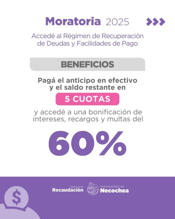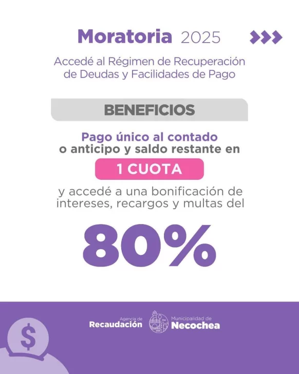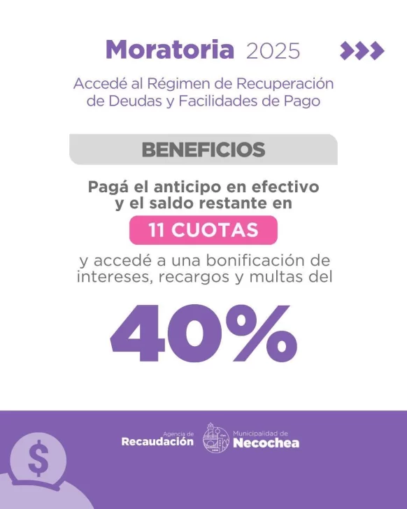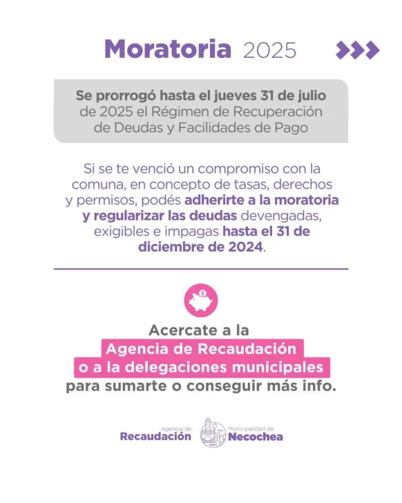 El Departamento Ejecutivo municipal resolvió prorrogar hasta el próximo 31 de julio la vigencia del actual Régimen de Recuperación de Deudas y Facilidades de Pago, que comprende a los compromisos vencidos con la comuna en concepto de tasas, derechos y permisos hasta el 31 de diciembre de 2024.