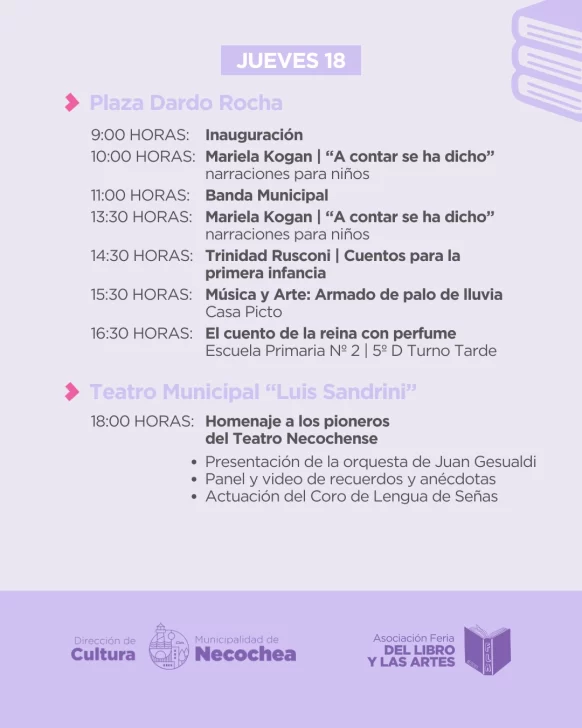 En tanto, desde las 18 la actividad se concentrará en el Teatro Municipal Luis Sandrini con un homenaje a los Pioneros del teatro necochense. En ese marco, estará la presentación de la orquesta de Juan Gesualdi, un panel y video de recuerdos y anécdotas, y la actuación del coro de lenguas y señas.
