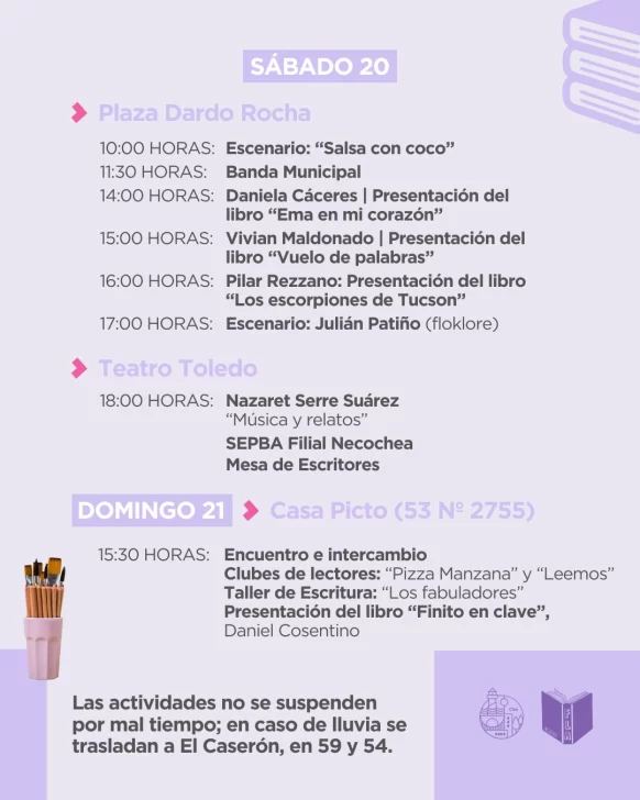 Mientras que, el sábado 20, además de la propuesta de la plaza desde las 10 hasta la tarde, se sumará como espacio el Teatro Toledo, que desde las 18 hs ofrecerá “Música y relatos” con Nazaret Serre Suárez.